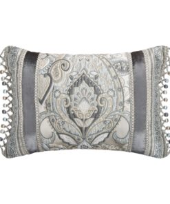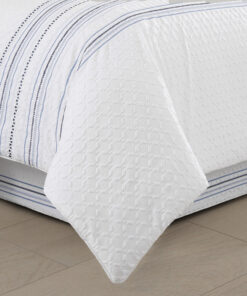 Modern quilted engineering gives the Alaro Comforter Set a luxurious multi-textural appearance. The shimmering spa. silver. and gold fabric is embossed with inlaid techniques. combined with a bordered bed runner with harmonious geometric patterns to create a unique layered illusion. The tailored bed skirt features a split-corner construction and the pillow shams are meticulously cut and sewn. positioning the pattern perfectly in the center. Pair this bedding collection with the Alaro throw pillows. Euros. and window treatments for a complete look.