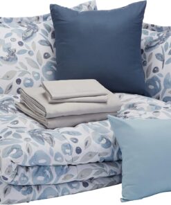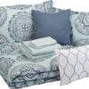 This 10-piece queen comforter set includes a 90 x 90-inch comforter, 90 x 102-inch flat sheet, 60 x 80 x 14-inch fitted sheet, (2) 20 x 26-inch shams(no pillow included), (2) 20 x 30-inch pillowcases(no pillow included), (1) 60 x 80 x 16-inch bedskirt, (1) 12 x 16-inch rectangle pillow and (1) 16 x 16-inch square pillow.