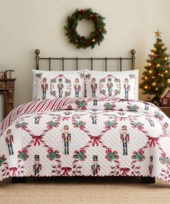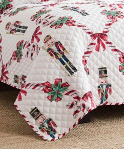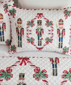 The Avanti Nutcracker March Decorative Full/Queen Quilt Set features a trellis pattern with nutcrackers in the center framed by candy canes with bows and holly. Reverses to a red and white diagonal stripe. Printed on 100% polyester for brilliant color. Set includes (1) 86″ x 86″ quilt, (2) 20″ x 26″ standard shams.