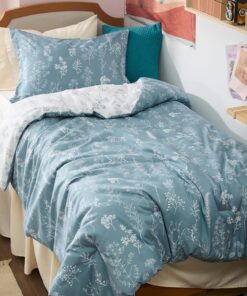 This comforter set is reversible with vivid floral and tree branch patterns in contrasting colors.