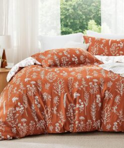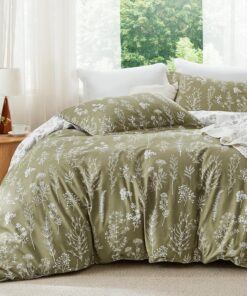 This comforter set is reversible with vivid floral and tree branch patterns in contrasting colors.