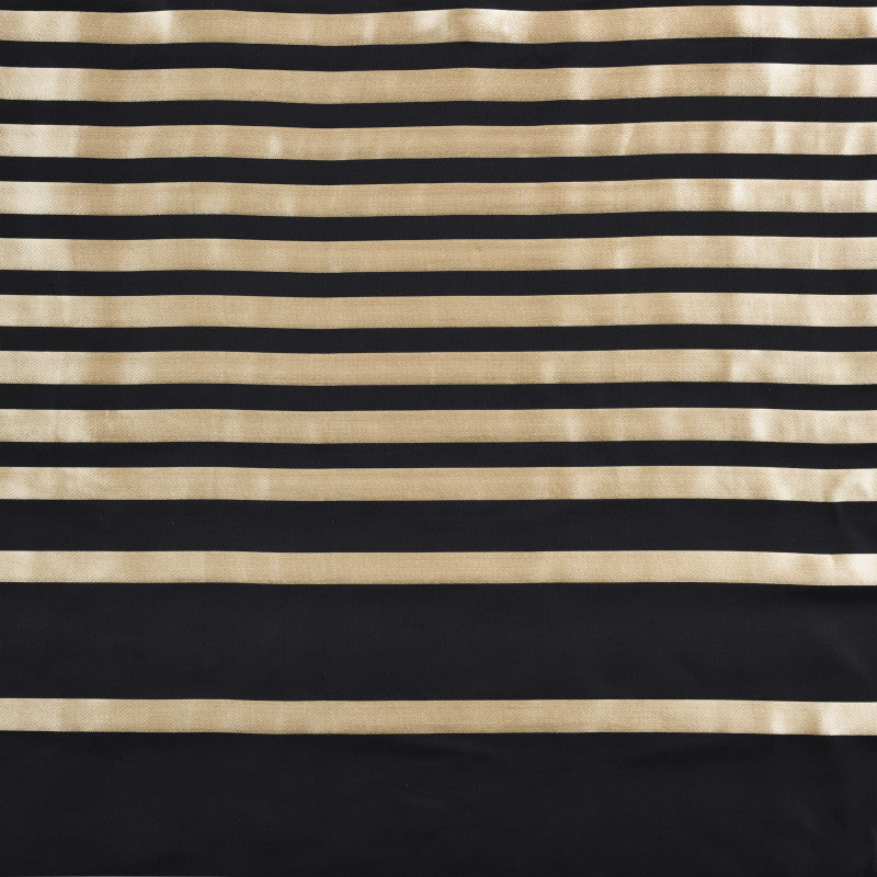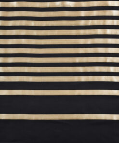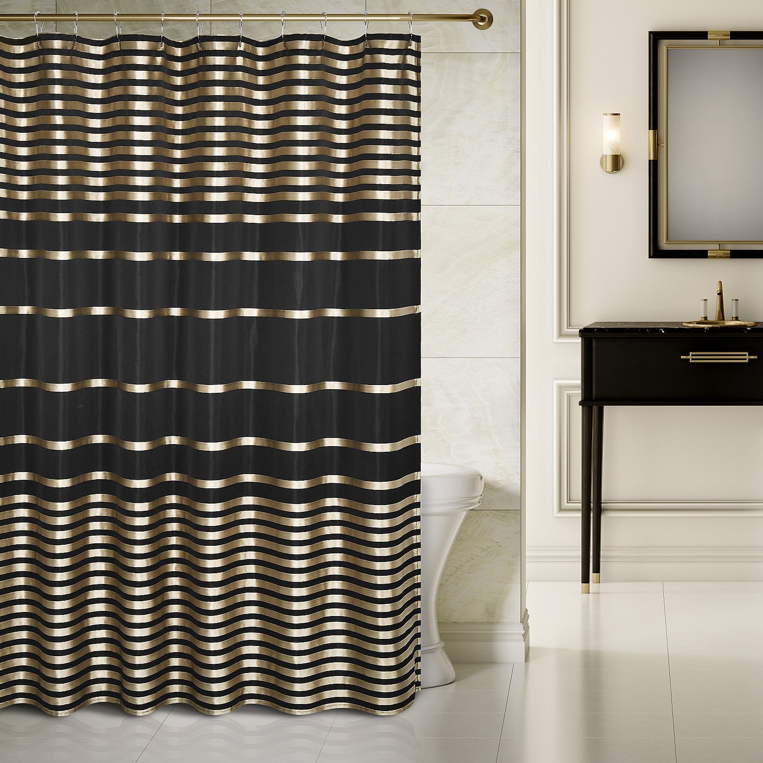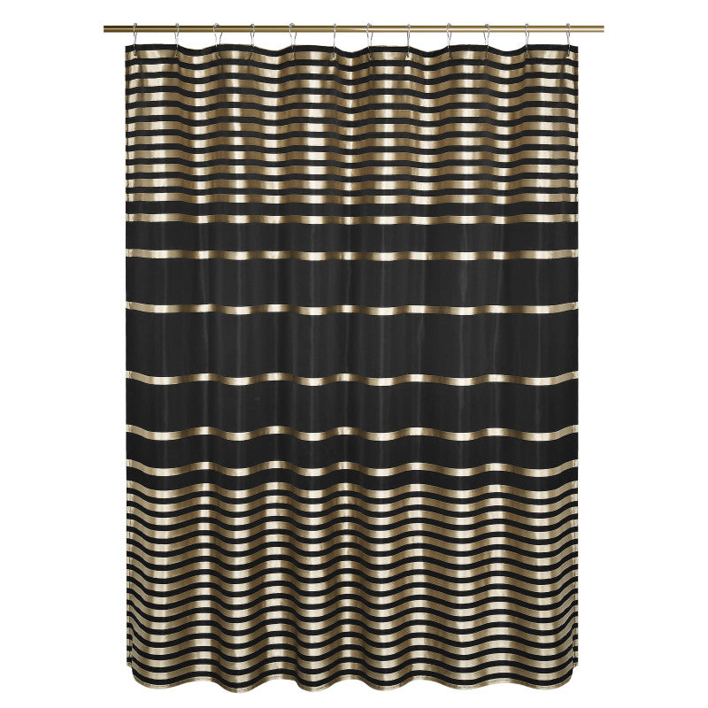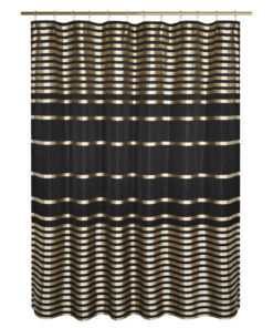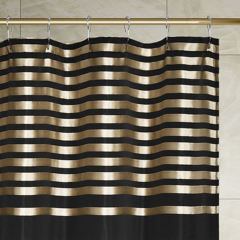 The Calvari Shower Curtain features a modern engineered stripe design that gives a luxurious multi-layered appearance. The shimmering black and gold woven satin fabric is paneled on a grand scale. with individual stripes strategically spaced out. adding depth and elevated glamour to your bathroom (Shower liner is recommended).