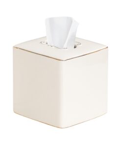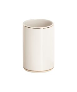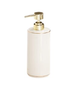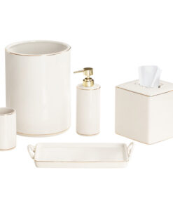 Add timeless elegance to your bathroom decor with the Delphine stoneware bath accessories. Featuring a glossy ivory finish and delicate gold trim. this set offers a sophisticated touch. Perfect for creating a polished. coordinated look while keeping your essentials stylishly organized. The Delphine collection consists of a lotion/soap dispenser. tumbler. vanity tray. wastebasket. and tissue box cover.