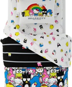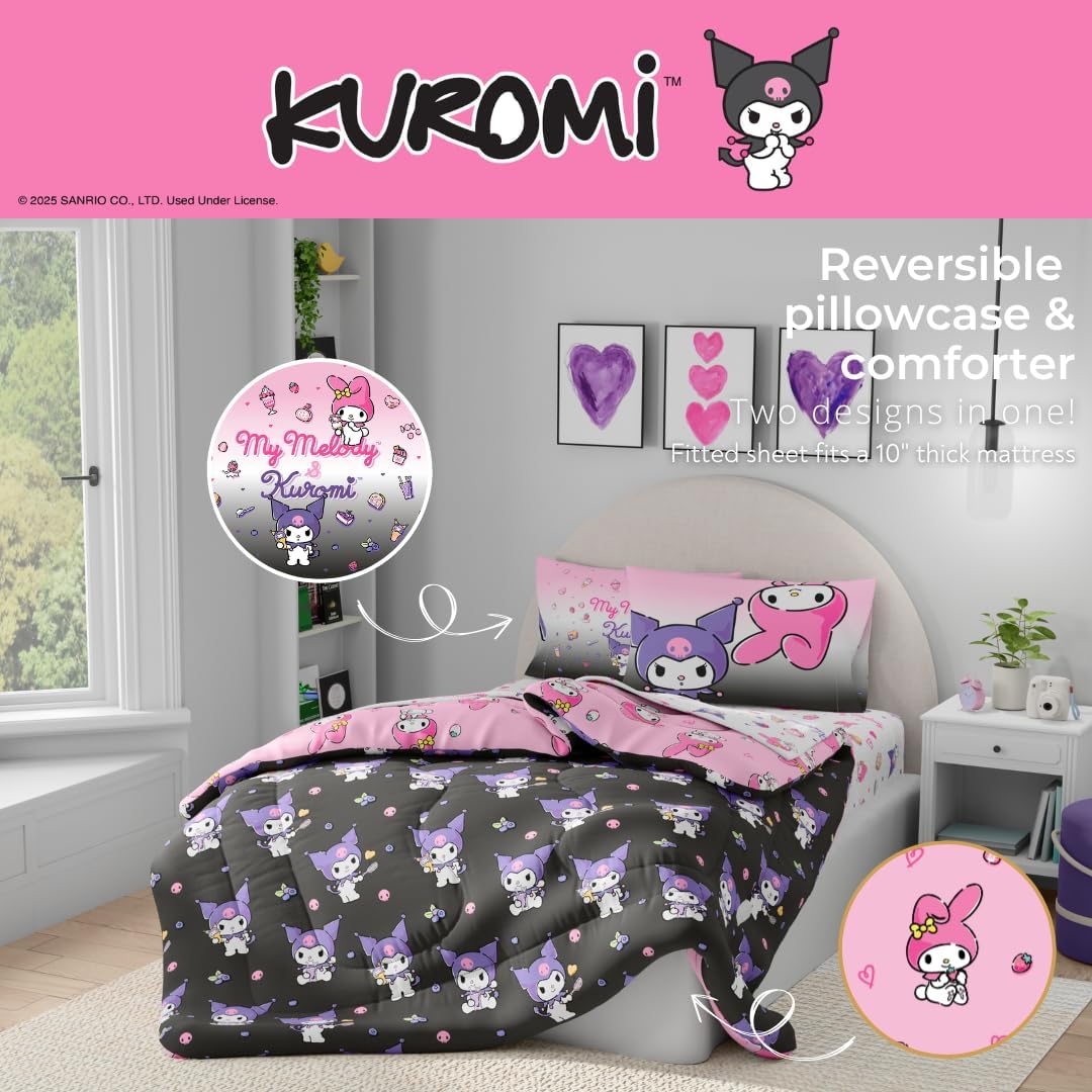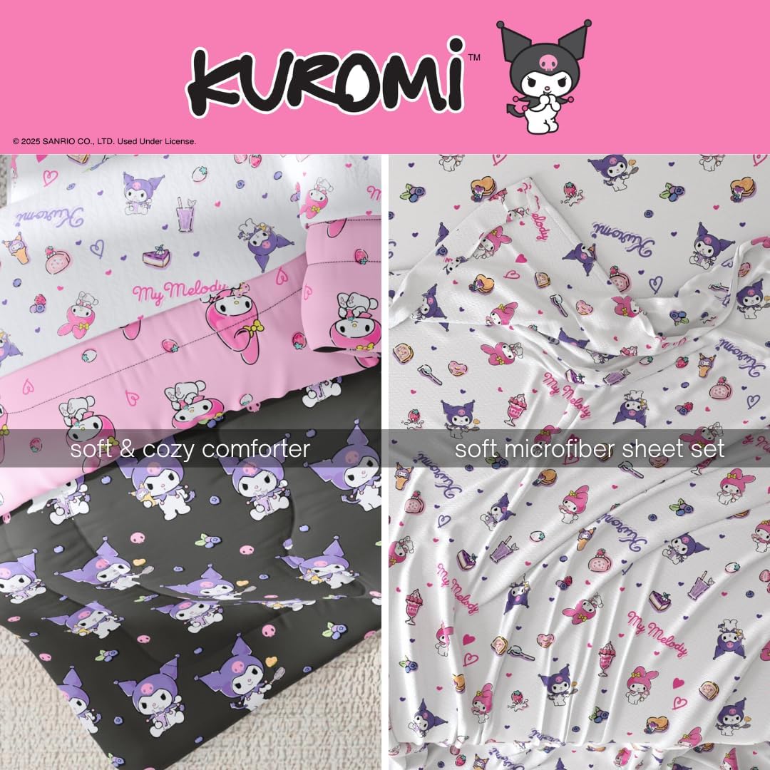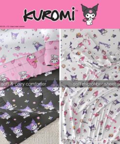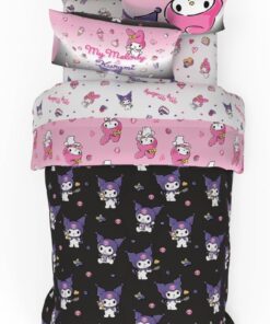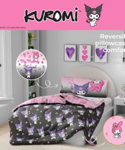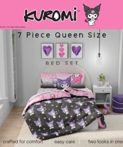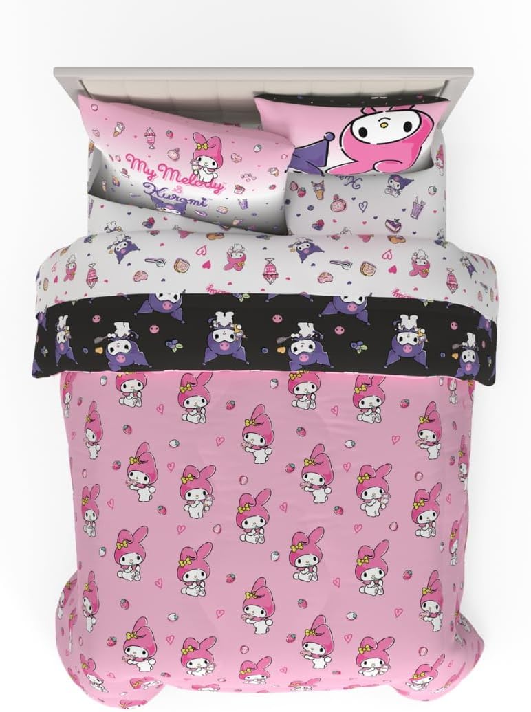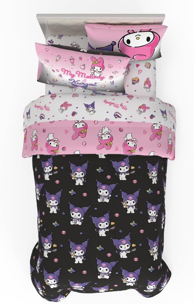 Drift into a world of sweet and sassy dreams with this My Melody and Kuromi Bed Set! One side of the comforter features Kuromi striking playful poses on a bold black background, while the reverse showcases My Melody surrounded by hearts on a soft pink backdrop. Whether you’re feeling mischievous or totally kawaii, this reversible design lets you change the vibe whenever you want. The coordinating sheets add extra charm with an allover print of My Melody and Kuromi in pastel tones. Made from super soft, cozy microfiber, this set includes a comforter, fitted sheet, flat sheet, and pillowcase(s) and comes in sizes twin through full. It’s the ultimate combo of comfort and Sanrio style, perfect for fans of all ages. Easy to care for and machine washable, this officially licensed bedding brings a splash of cuteness and comfort to your room. Snuggle up, show off your favorite characters, and turn bedtime into a magical Sanrio moment!