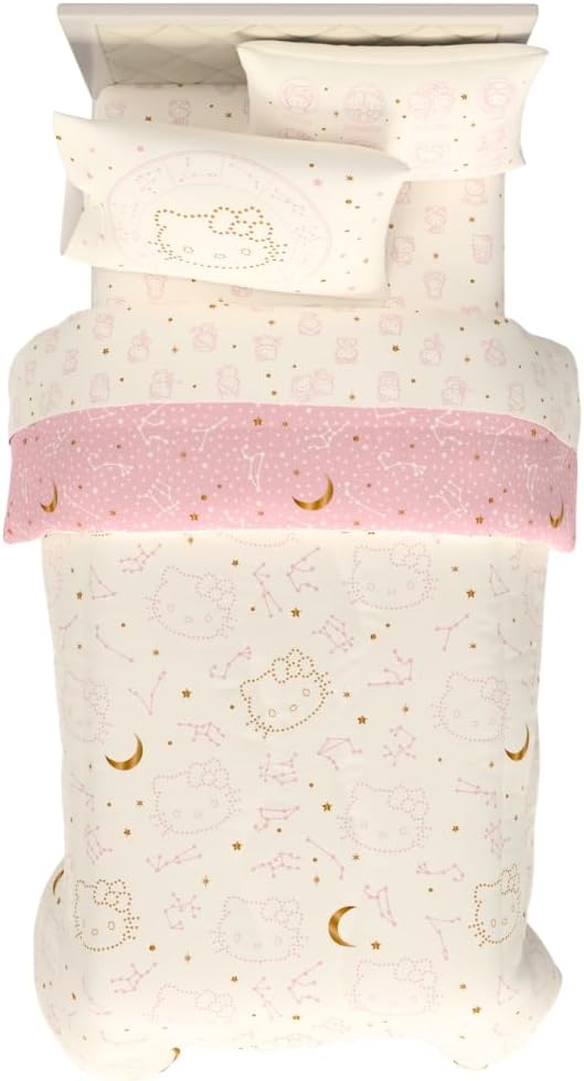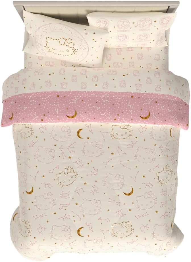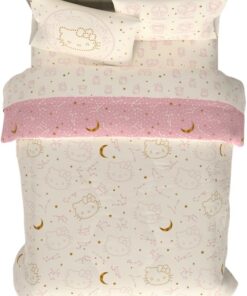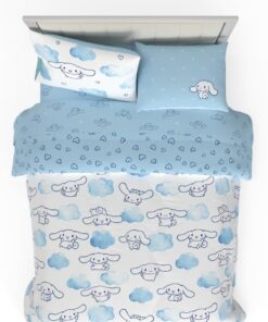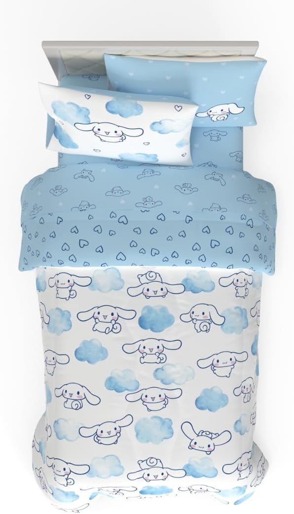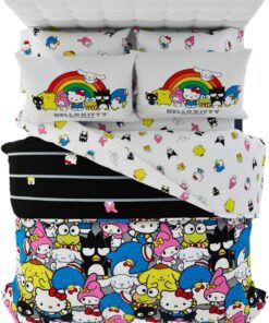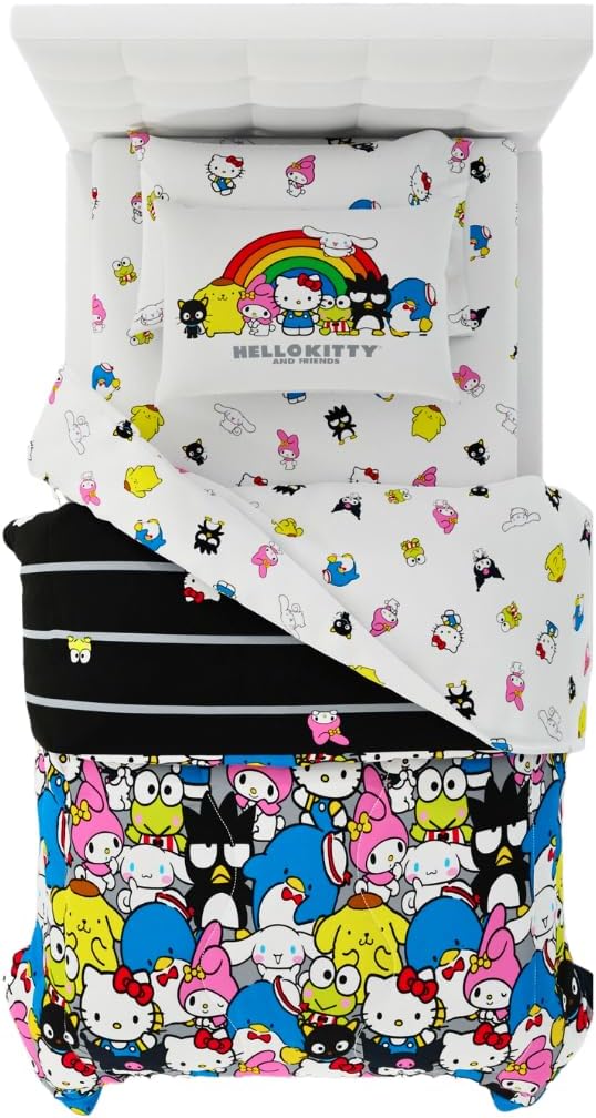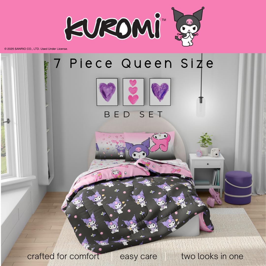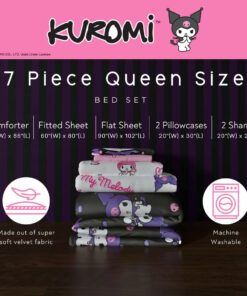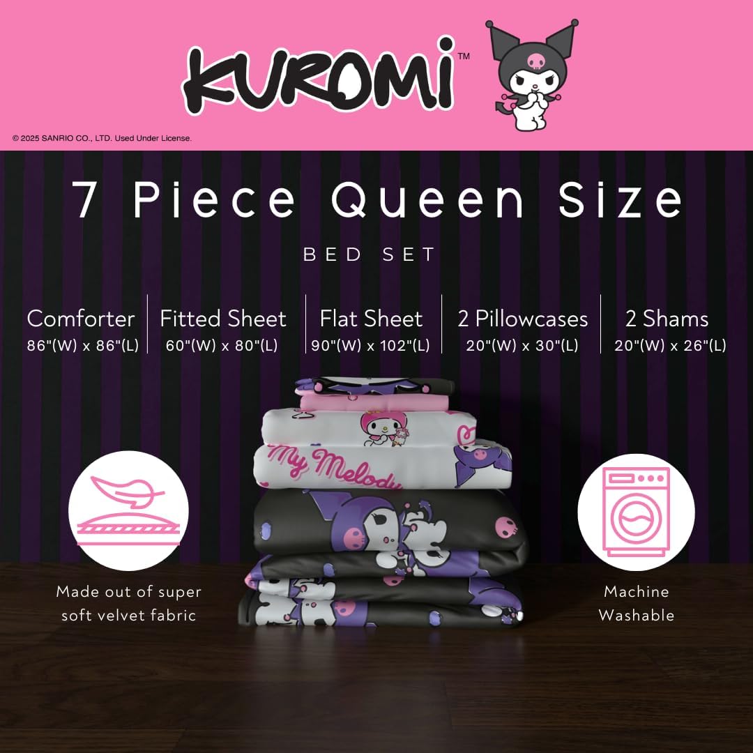 Drift into a world of sweet and sassy dreams with this My Melody and Kuromi Bed Set! One side of the comforter features Kuromi striking playful poses on a bold black background, while the reverse showcases My Melody surrounded by hearts on a soft pink backdrop. Whether you’re feeling mischievous or totally kawaii, this reversible design lets you change the vibe whenever you want. The coordinating sheets add extra charm with an allover print of My Melody and Kuromi in pastel tones. Made from super soft, cozy microfiber, this set includes a comforter, fitted sheet, flat sheet, and pillowcase(s) and comes in sizes twin through full. It’s the ultimate combo of comfort and Sanrio style, perfect for fans of all ages. Easy to care for and machine washable, this officially licensed bedding brings a splash of cuteness and comfort to your room. Snuggle up, show off your favorite characters, and turn bedtime into a magical Sanrio moment!