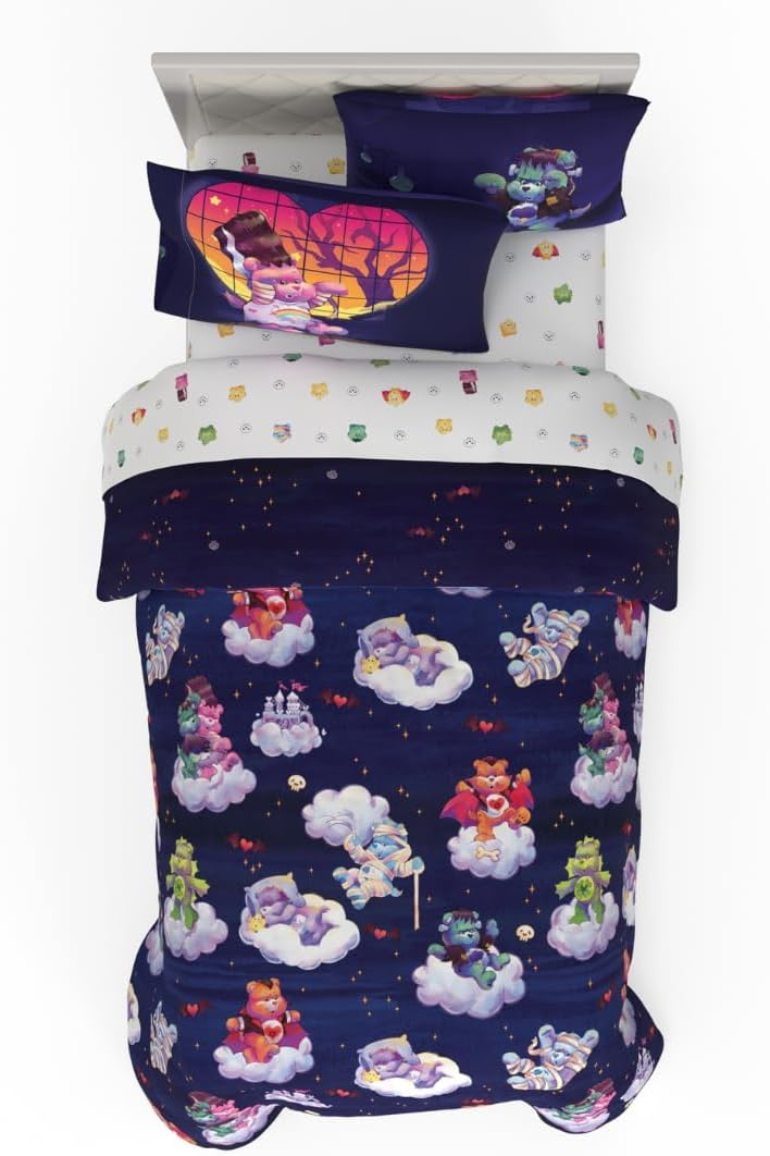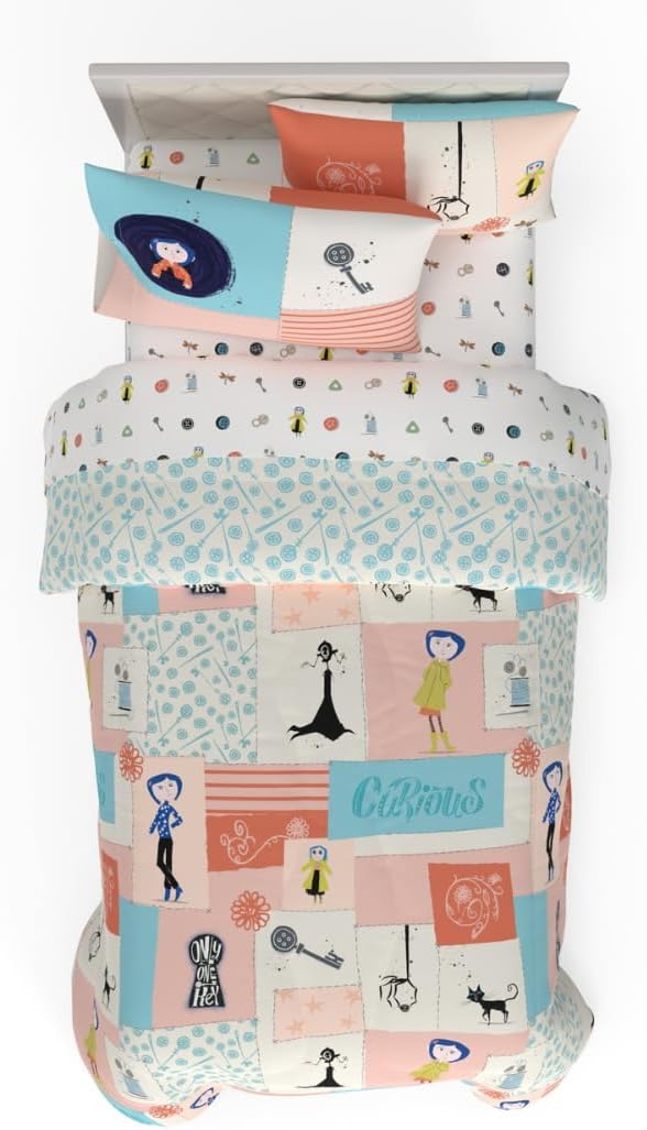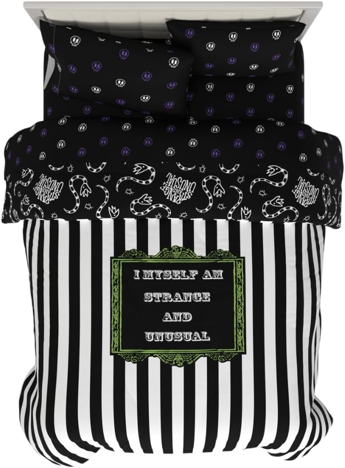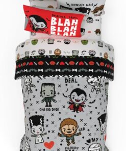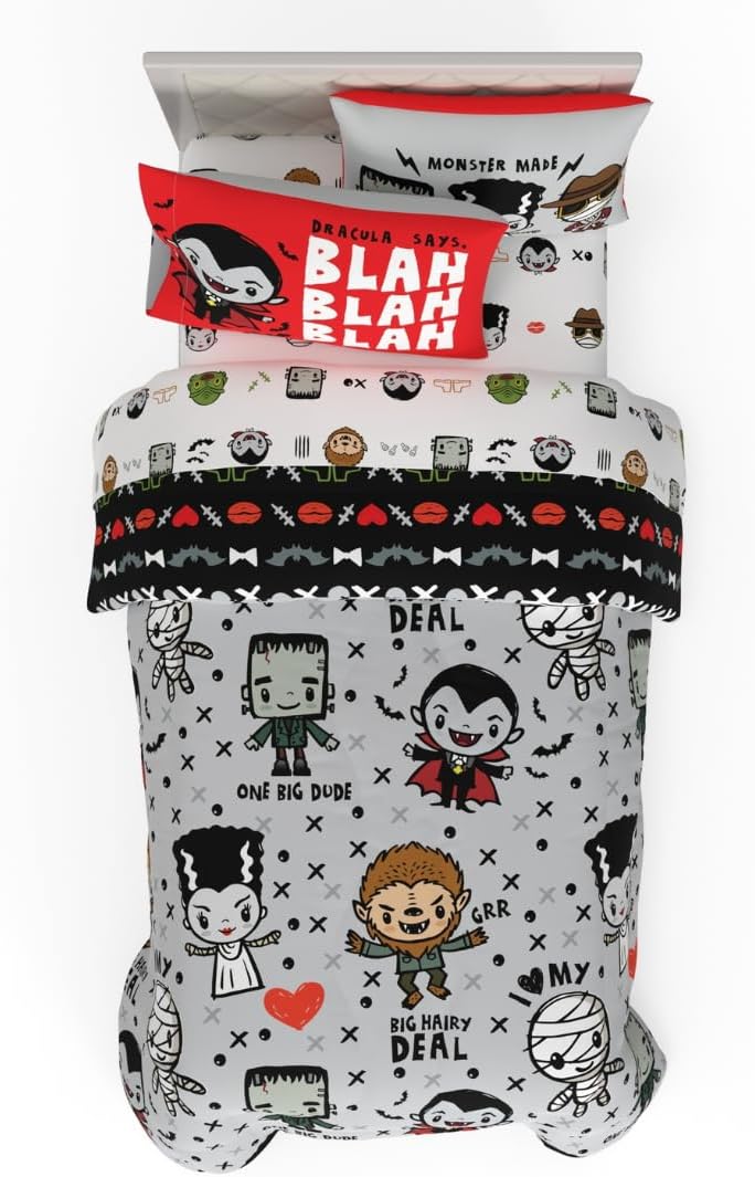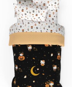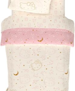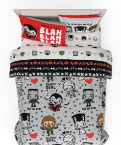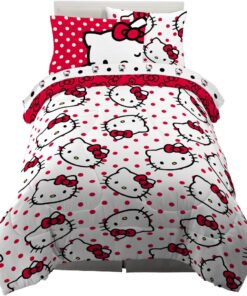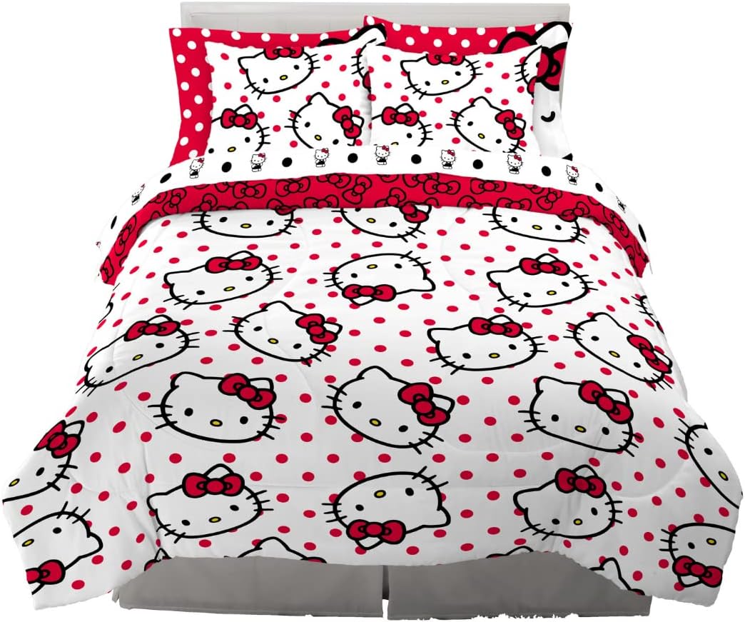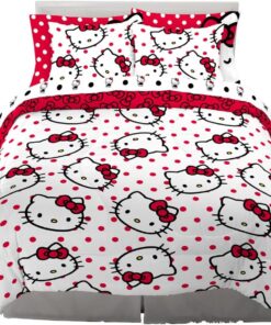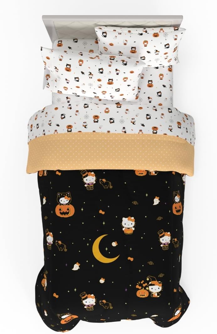 Drift into a world of sweet and sassy dreams with this My Melody and Kuromi Bed Set! One side of the comforter features Kuromi striking playful poses on a bold black background, while the reverse showcases My Melody surrounded by hearts on a soft pink backdrop. Whether you’re feeling mischievous or totally kawaii, this reversible design lets you change the vibe whenever you want. The coordinating sheets add extra charm with an allover print of My Melody and Kuromi in pastel tones. Made from super soft, cozy microfiber, this set includes a comforter, fitted sheet, flat sheet, and pillowcase(s) and comes in sizes twin through full. It’s the ultimate combo of comfort and Sanrio style, perfect for fans of all ages. Easy to care for and machine washable, this officially licensed bedding brings a splash of cuteness and comfort to your room. Snuggle up, show off your favorite characters, and turn bedtime into a magical Sanrio moment!