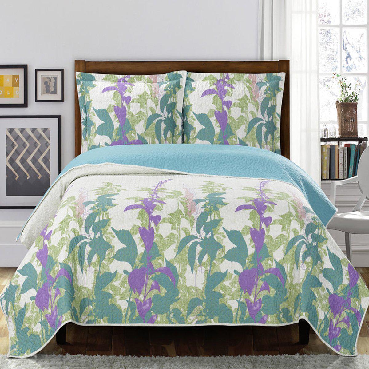 Liven up your bedroom with the captivating Freya oversized Quilt set. This beautiful quilt features a ingenious and natural style of floral designs in lavender and shades of green. The reversible side of the coverlet features a pretty solid aqua background.Â