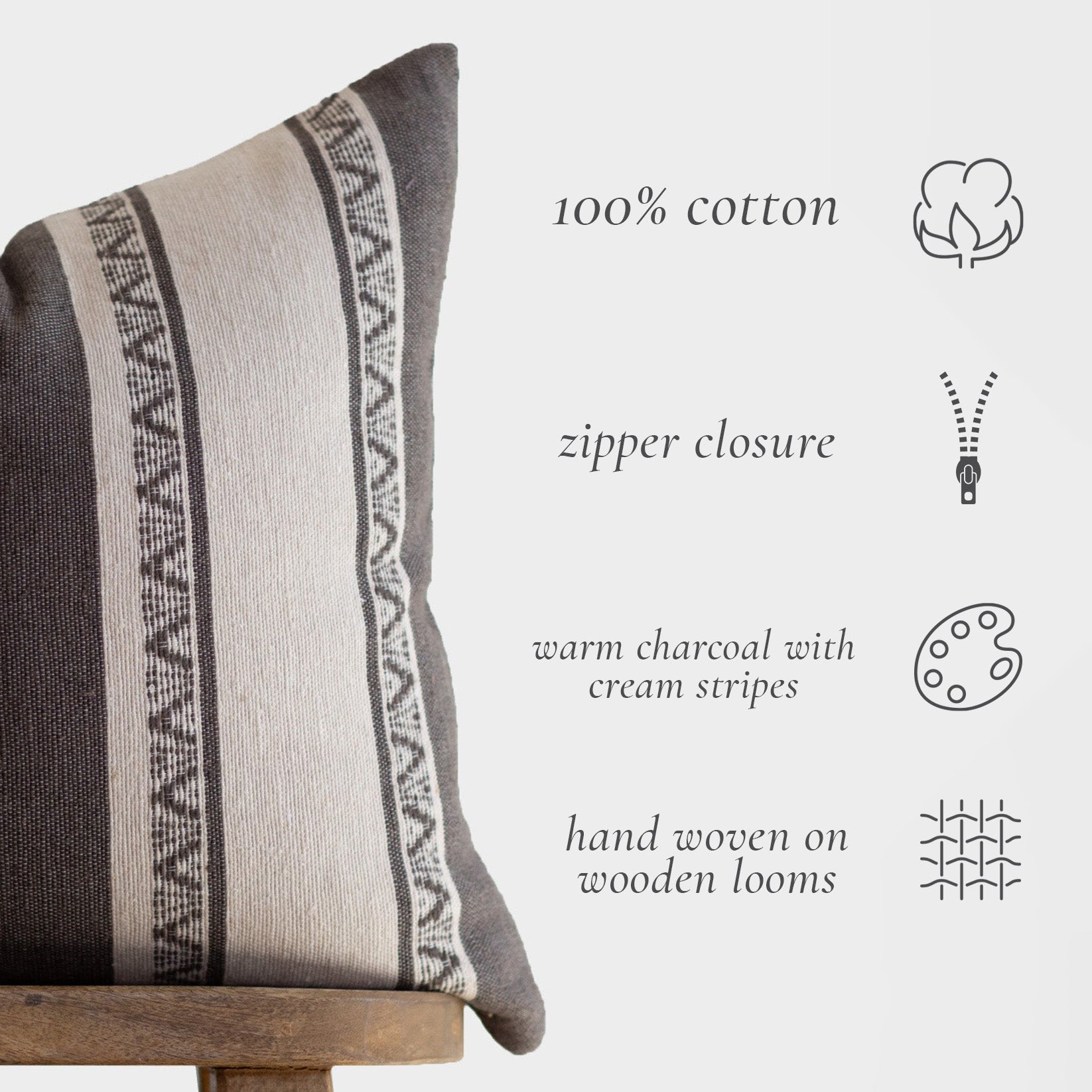 Add a touch of playful warmth and fun to any space with our Kole pillow cover. Handmade in Morocco with warm charcoal and cream stripes. this unique cover features a geometric striped pattern and adds interest to any space.Â