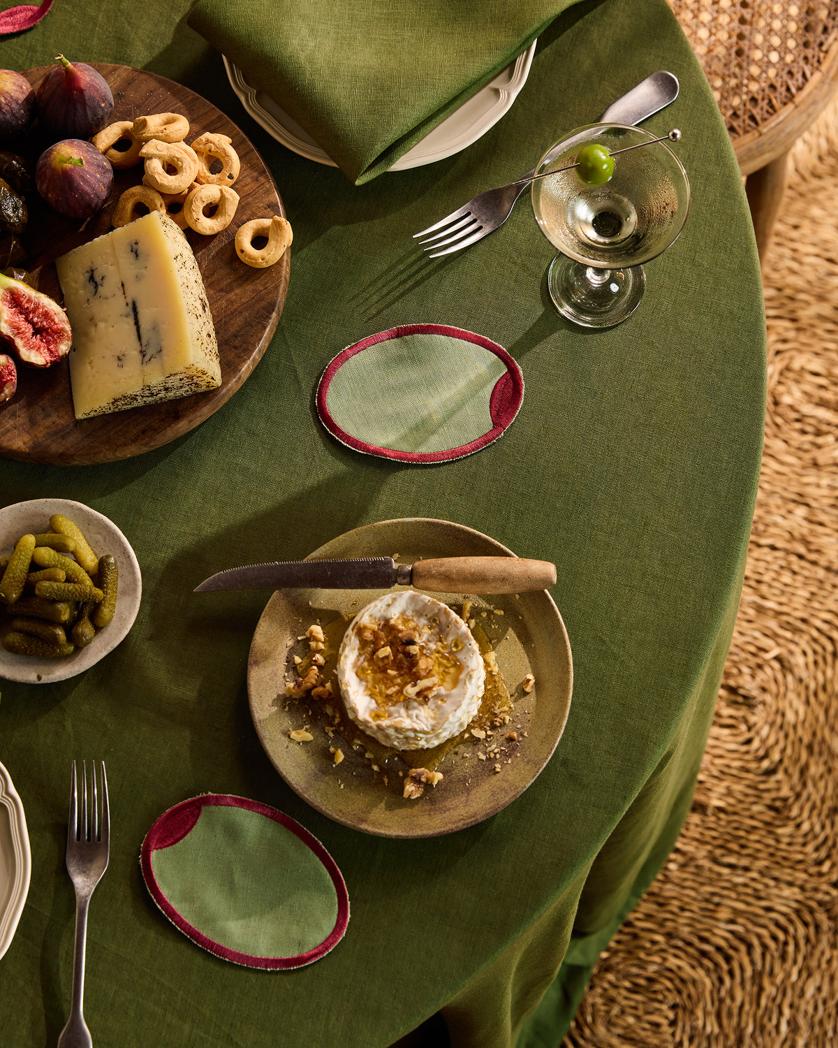 The perfect garnish atop your table. our Olive Coasters are for those who love the finer things. An expertly mixed cocktail. vintage drop or classic espresso – just about anything tastes better when served on these stylish conversation starters. Complete with an embroidered Mulberry trim tracing a plump olive shape. this set includes two Pistachio and two Olive-toned coasters.
