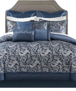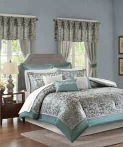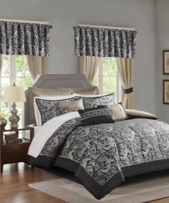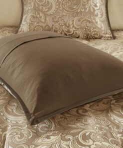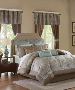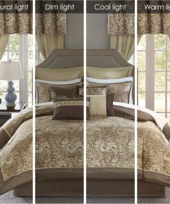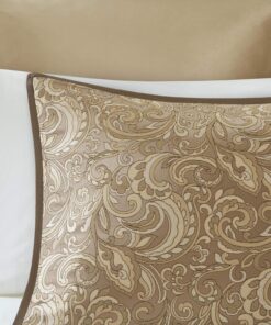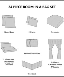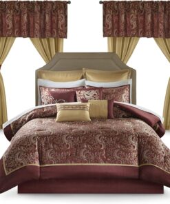 The Madison Park Essentials Brystol 24 Piece Room in a Bag provides a total makeover for your bedroom decor. This traditional comforter flaunts a brown, taupe, and gold jacquard paisley pattern with an accenting solid brown border to create a luxurious glam look. Matching pillow shams and solid soft gold Euro shams with 2-inch flanges coordinate beautifully with the elegant comforter. A solid brown bed skirt and 4 decorative pillows with embroidery and pleating details add the finishing touches to this paisley bedding set. Polyester filling in the comforter and pillows contains no allergens and is treated to be dustproof. A 4 Piece sheet set is also included to complement the comforter and complete the jacquard bedding set. To elevate your bedroom, 4 solid soft gold window curtains with 2 paisley valances and 2 solid tiebacks are included to perfectly style your windows. Machine washable for easy care, this paisley comforter set may come in rolled or compressed packing and will need to be fluffed up. Use a steam iron to help remove wrinkles easier. Spot clean pillows.