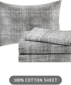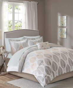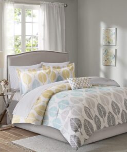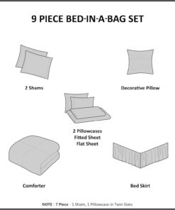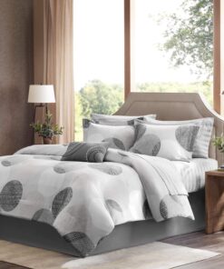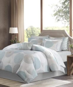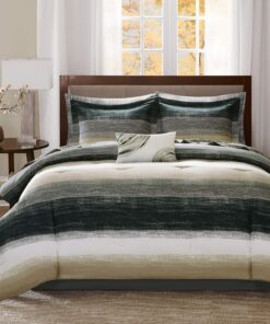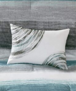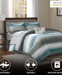 The Madison Park Essentials Saben 9 Piece Complete Bed and Sheet Set provides a casual and modern update to your bedroom. A printed watercolor stripe motif, in aqua, grey, and white hues, is beautifully displayed on the ultra-soft microfiber comforter. The coordinating shams complement the pattern seen on top of the bed to pull the ensemble together. A 100% cotton sheet set includes a fitted sheet that fits up to a 16-inch mattress, a flat sheet, and two pillowcases in a textured grey hue to complement the casual style of the comforter. Completing the look is an embroidered decorative pillow in coordinating colors, while a solid grey bed skirt adds a creates a crisp finish to this incredibly soft complete bed and sheet set.
