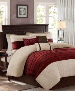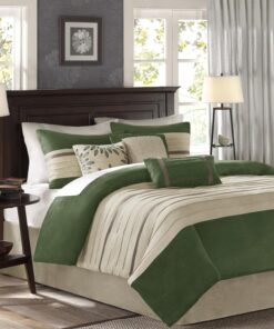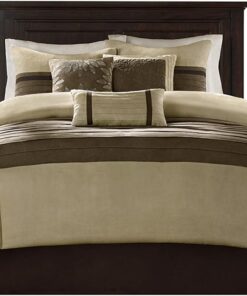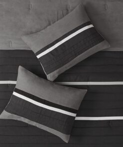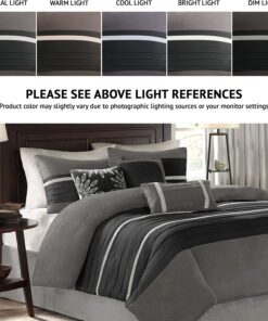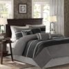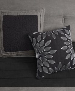 The Madison Park Palmer 7 Piece Comforter Set offers a classic and refined update to your bedroom decor. This transitional style comforter features a pieced microsuede design in rich contrasting black and grey colors to create an incredibly soft look and feel. The 2 matching shams also flaunt a pieced construction to coordinate with the faux suede comforter. A solid grey bed skirt and 3 decorative pillows with a mix of embroidered designs add the perfect finishing touches to complete this lush traditionally-inspired comforter. Machine washable for easy care, items in the set may come in a rolled or compressed packaging, which will need to be fluffed up or steam ironed before use to remove wrinkles.