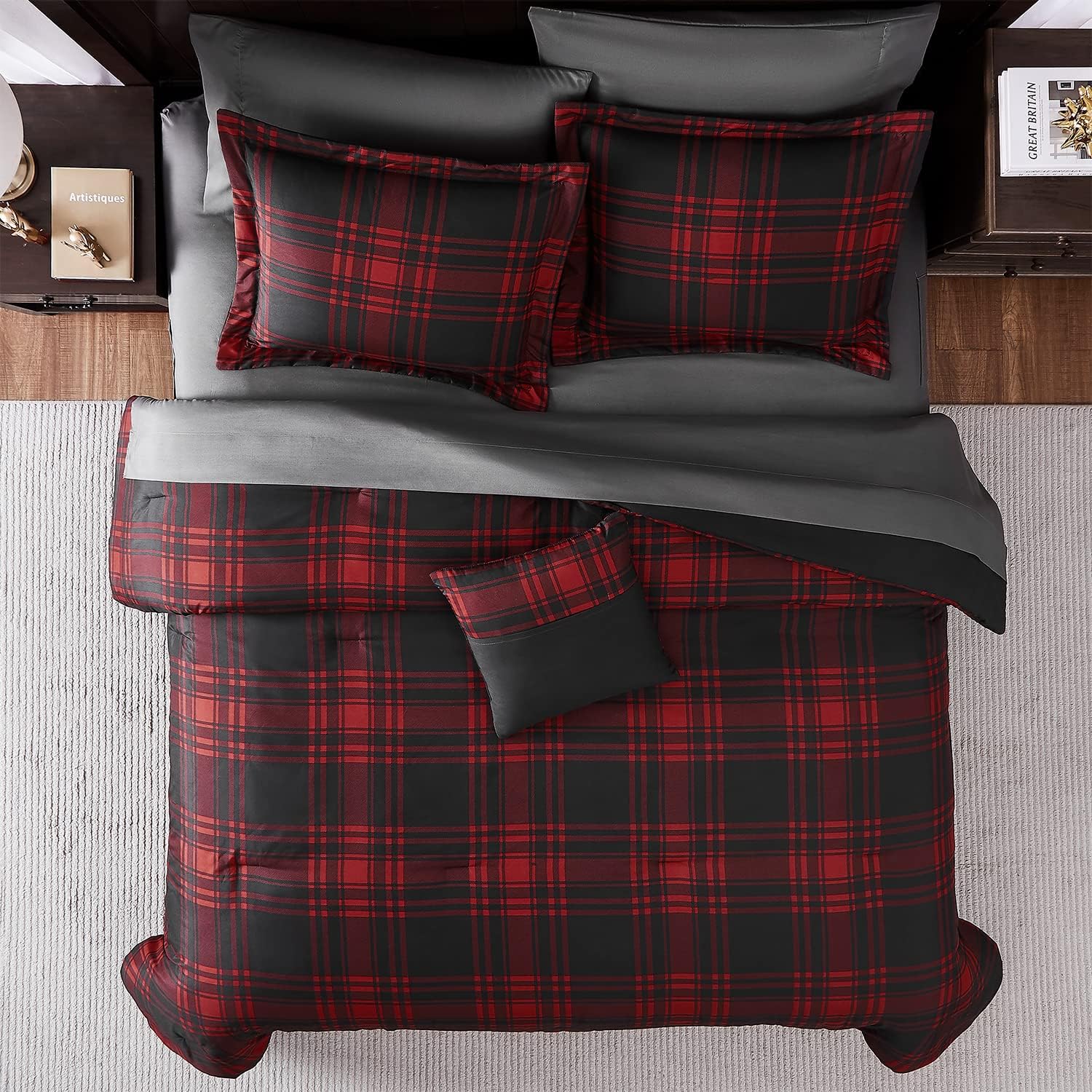 MaiRêve Full Size Comforter Sets, Red Black Plaid Comforter Set 7 Pieces, All Season Bedding Sets Full, Festival Bedding Warm and Breathable 80″*90″(Red, Full)
