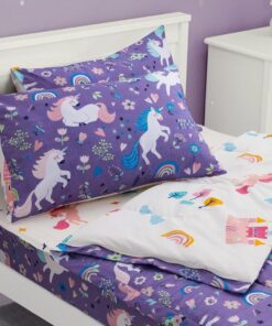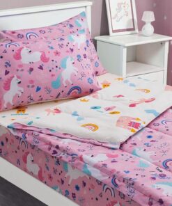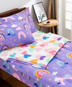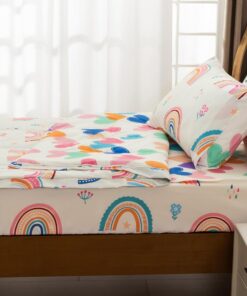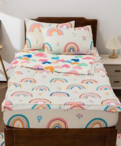This beige comforter for girls has rainbows, flowers, grass on the front. The back of the comforter is composed of colorful love patterns, so that children fall asleep in the warmth of love.