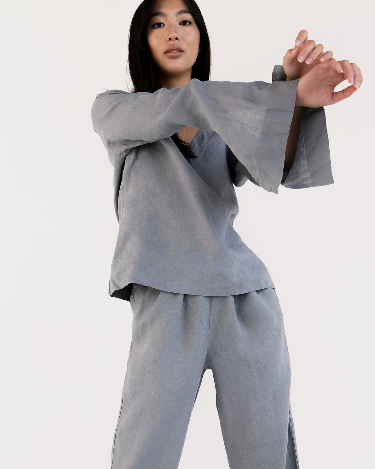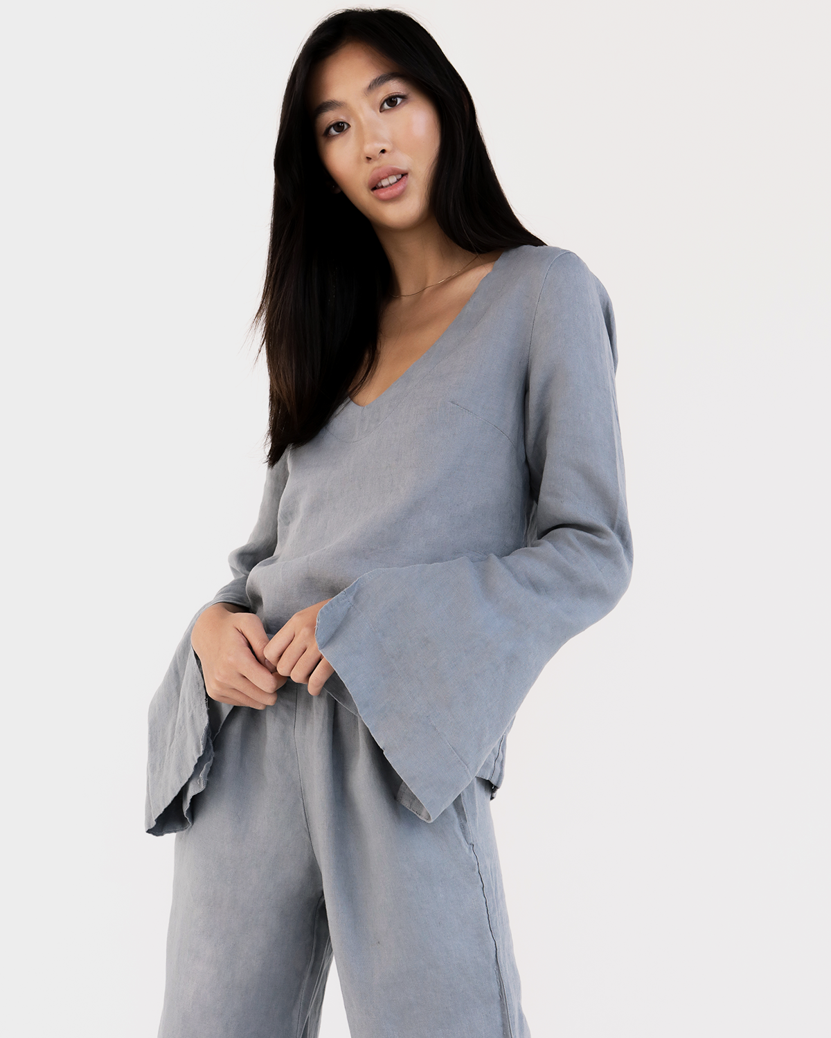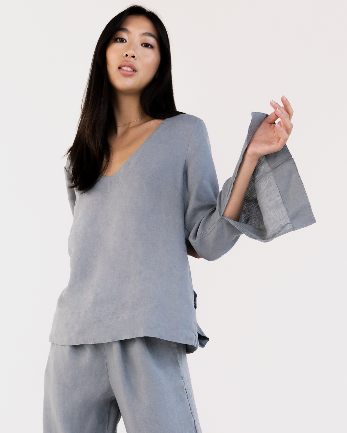 Easy. breezy and comfortably oversized. our 100% French Flax Linen Top is the pyjama shirt of your dreams. The billowing bell sleeves and deep v-neckline are a nod to the ’70s. while the loose silhouette and buttery soft fabrication is made for relaxed days spent in or out of the house. Pair with our 100% French Flax Linen Pants for the ultimate co-ordinated two-piece look. or style it on its own with the bottoms of your choice—trust us when we say this sartorial multi-tasker will be one of the hardest working pieces in your wardrobe.