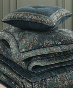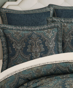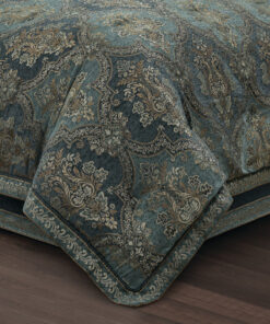 The Nancy Comforter Set features a stunning traditional woven damask paired with an intricately designed chenille weave. The dark teal. green. and gold colors in this bedding ensemble add a sophisticated look to any bedroom. The comforter is generously oversized and overfilled and finished with a lovely medallion trim detail. Also included are 2 coordinate pillow shams. with a tailored woven chenille bedskirt which adds the finishing touch. Add the Nancy accessories and window treatments to complete the look.