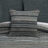 The Parallel 18 Inch Pillow features an embroidered Southwest Aztec pattern in slate. blue. silver and grey on a black ground. The embellished accent pillow is finished with a self-fabric cord and adds a unique rustic charm to your decor. Pair this pillow with the Parallel bedding and window treatments to complete the ensemble.