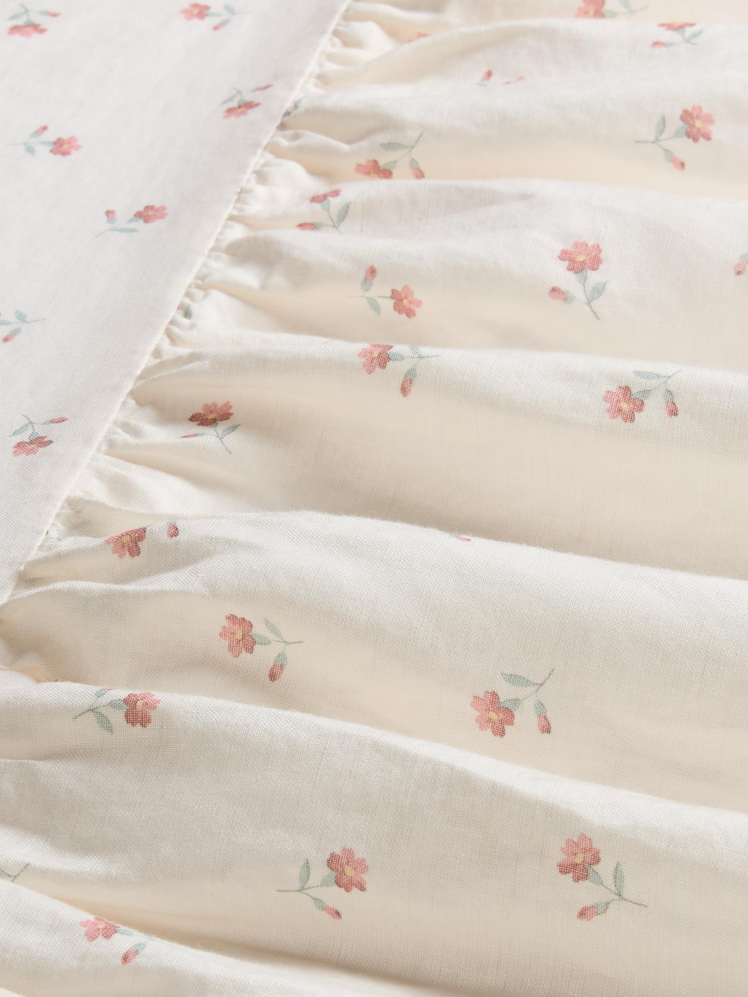 Romantic. whimsical and with a vintage-feel. our Posy Bud linen blend bed skirt will have you dreaming of warm days spent reading in a countryside cottage garden. Featuring a delicate floral motif. this classic gathered skirt drapes beautifully with its soft frills. Our bed skirts have a 15-inch drop from the base to the floor and come in four sizes for twin. full. queen and king beds.