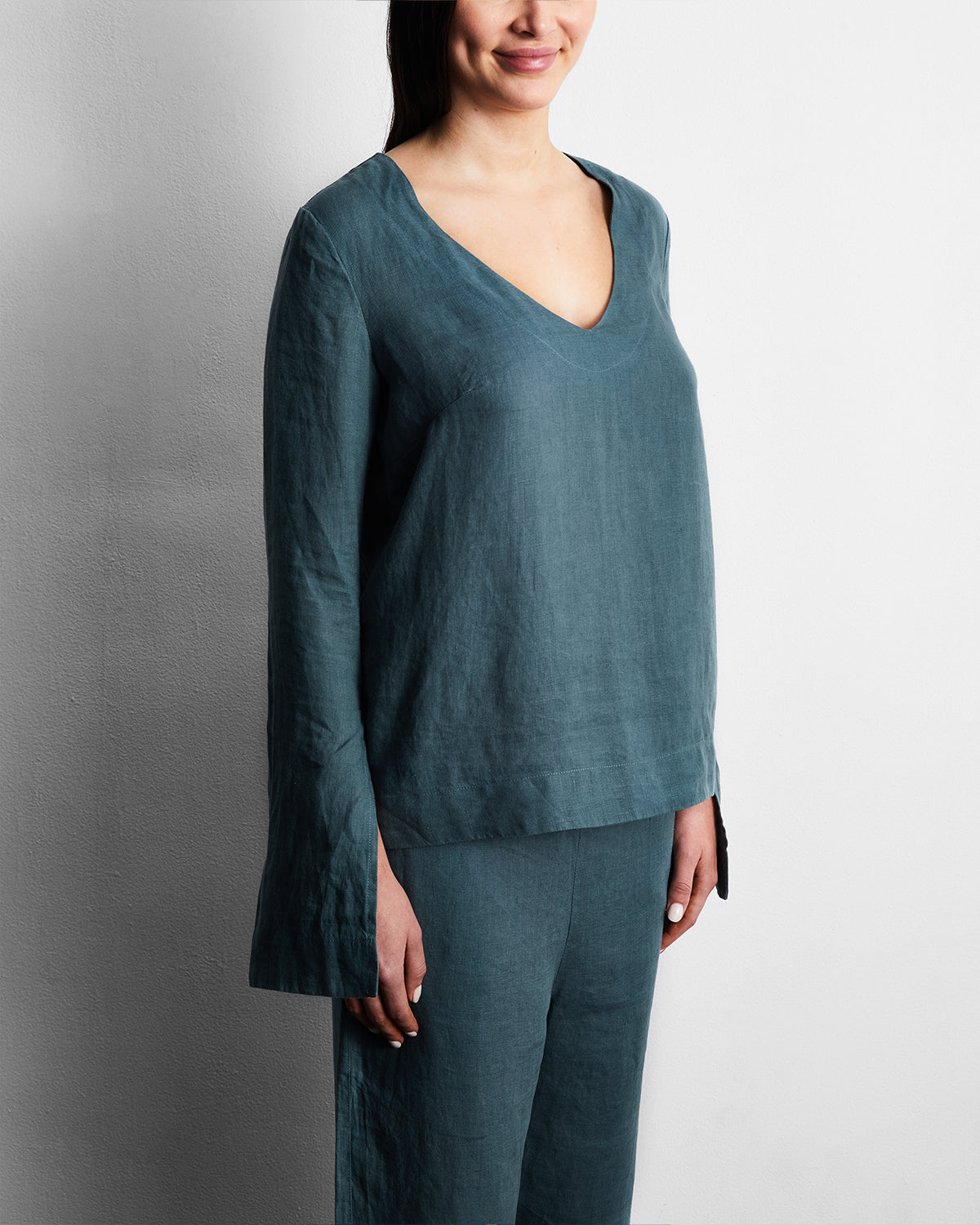 Easy. breezy and comfortably oversized. our 100% French Flax Linen Top is the pyjama shirt of your dreams. The billowing bell sleeves and deep v-neckline are a nod to the ’70s. while the loose silhouette and buttery soft fabrication is made for relaxed days spent in or out of the house. Pair with our 100% French Flax Linen Pants for the ultimate co-ordinated two-piece look. or style it on its own with the bottoms of your choice—trust us when we say this sartorial multi-tasker will be one of the hardest working pieces in your wardrobe.