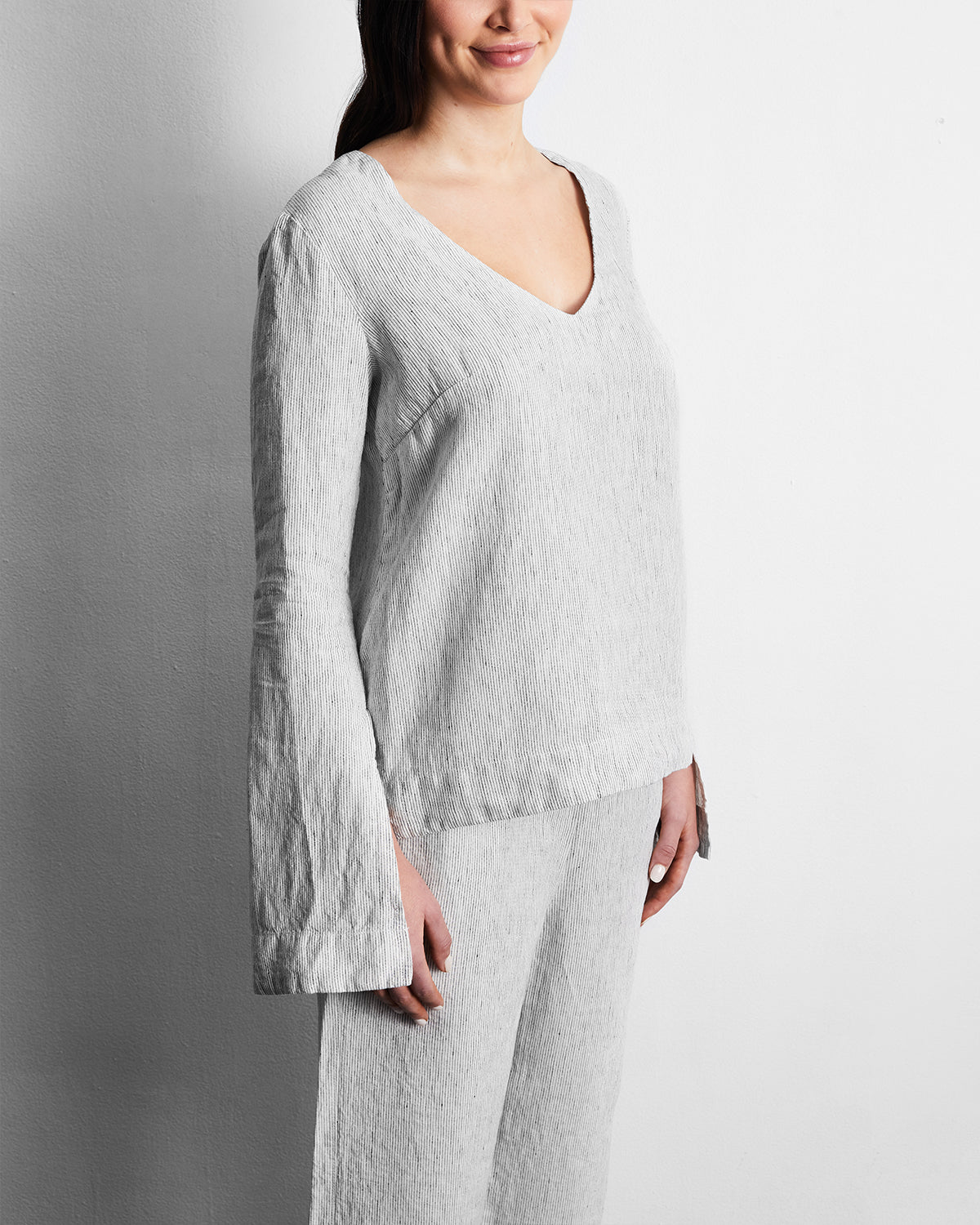 Easy. breezy and comfortably oversized. our 100% French Flax Linen Top is the pyjama shirt of your dreams. The billowing bell sleeves and deep v-neckline are a nod to the ’70s. while the loose silhouette and buttery soft fabrication is made for relaxed days spent in or out of the house. Pair with our 100% French Flax Linen Pants for the ultimate co-ordinated two-piece look. or style it on its own with the bottoms of your choice—trust us when we say this sartorial multi-tasker will be one of the hardest working pieces in your wardrobe.