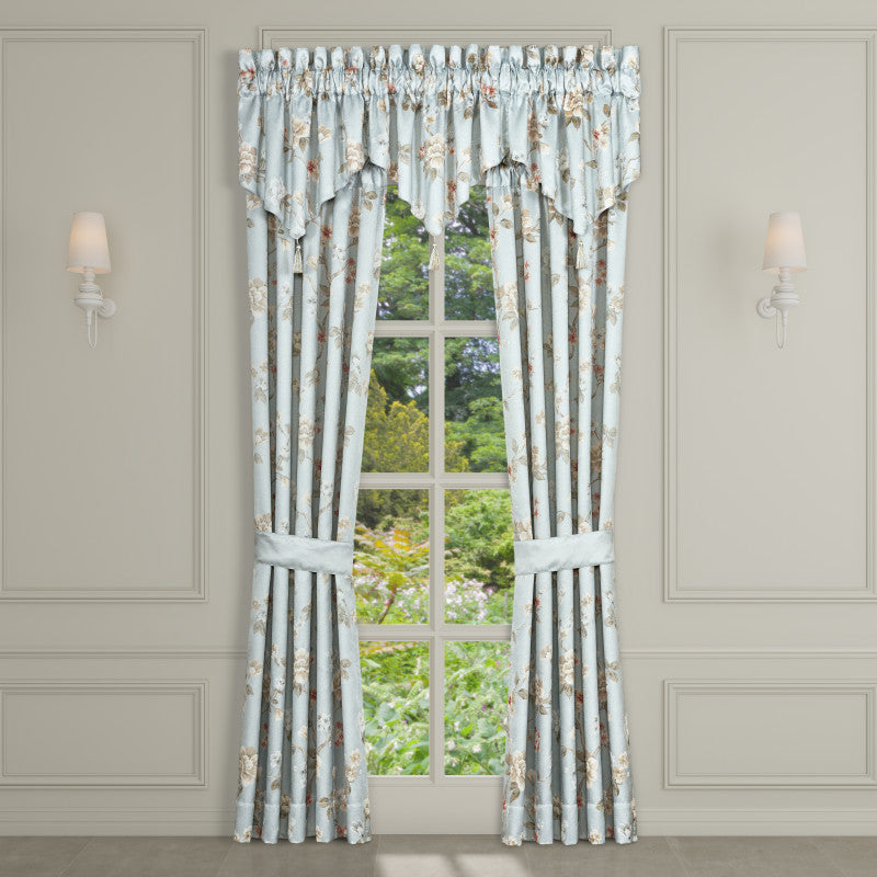 The Prestige Ascot Valance is constructed with a beautiful woven floral design in stunning shades of spa. blue. and rose. Finished with an embellished multi-color tassel trim. making this country chic style window valance the perfect touch to your window. Pair this valance with the Prestige Window Panels and Bedding Collection to complete the look.