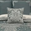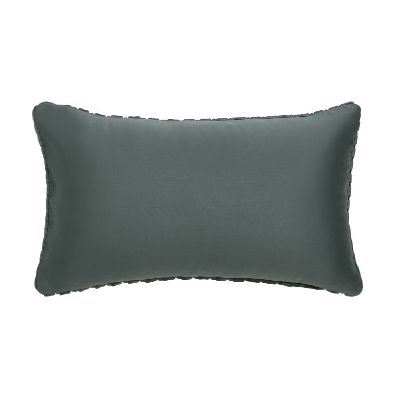 The uniquely crafted Renata Boudoir Pillow adds dimension to the ensemble with an ornate pleating technique cut from a woven teal satin fabric. The accent pillow reverses to solid teal and is specially made to coordinate with the Renata bed set.