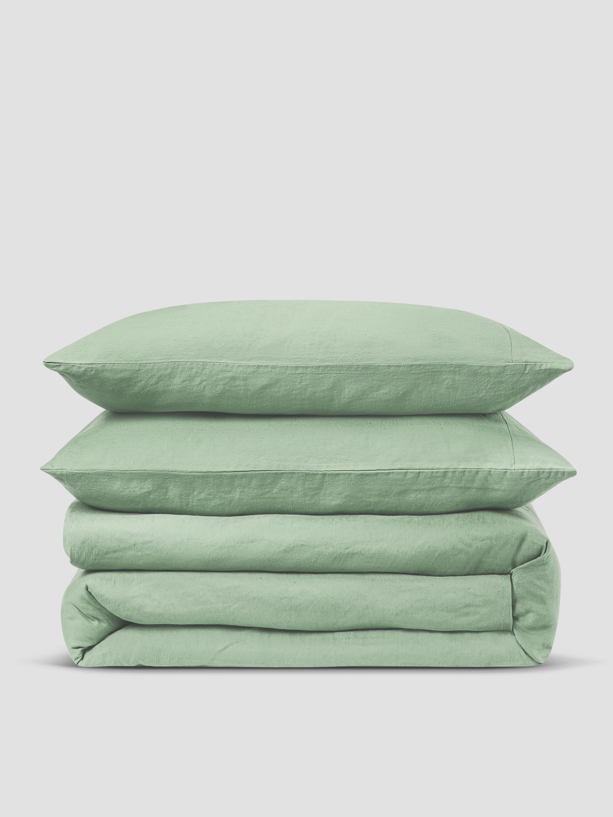With its muted hue and fresh feel. our Sage Green linen blend duvet set is perfect for creating a calm and soothing space. Made from only the highest-quality fibers. the breathable fabric combines the effortless look of linen with the softness of cotton. Our duvet set includes one duvet cover and one pair of pillowcases (standard size for twin and queen sets. and king size for king sets)