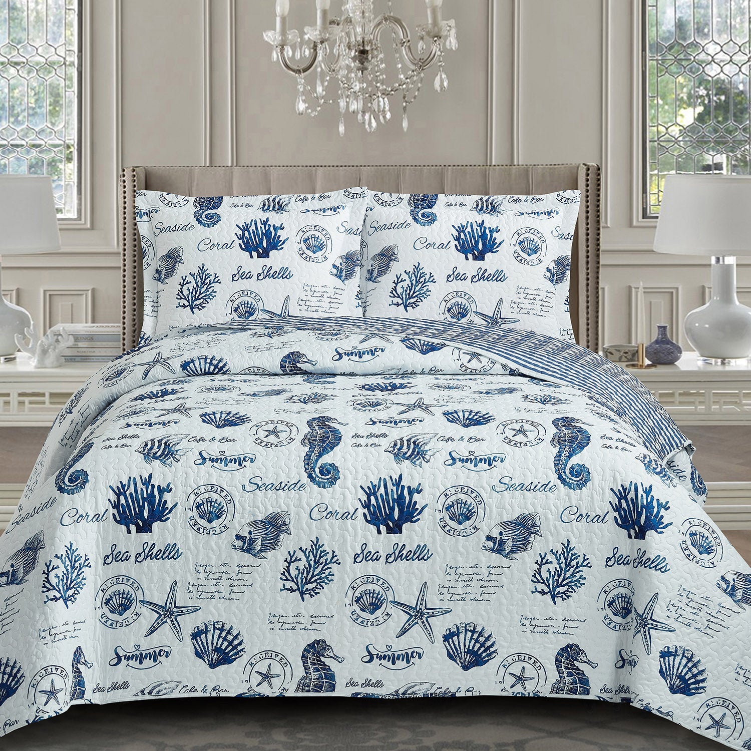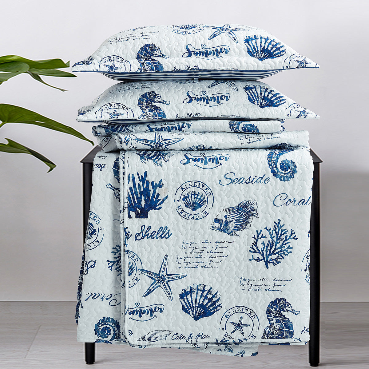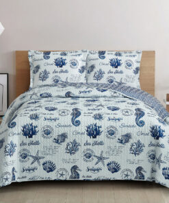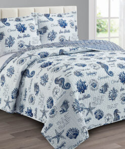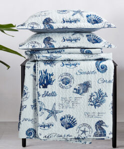 Set sail with this beautiful Nautical Seashells Quilt/ Bedspread Set. which reverses into a sailor pinstripe design. and turn your bedroom into a seaside getaway along the coastal shores. Drift off to sleep in soft high quality 100% microfiber that’s easy to care for. and machine washable. Great for layering or a stand-alone piece in the warmer summer months.