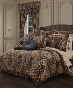 The Sofia 20 Decorative Throw Pillow is exquisite with its sophisticated use of pale blue. chocolate and gold colors. This beautiful square accent pillow is filled with fine details. including a woven chenille damask on the front and a woven chenille stripe on the reverse. and it is finished with a self-fabric cord for a polished trim. Pair this luxe accent pillow with the Sofia bedding set by J. Queen New York for a complete look.