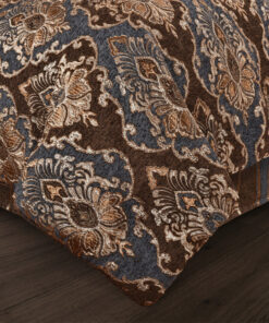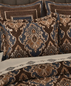 The Sofia 4 Piece Comforter Set Bedding Collection showcases timeless traditional style with its fine details and sophisticated use of soft blue. chocolate and gold colors. This beautiful woven chenille damask pattern is rich in craftsmanship with its 3-Dimensional weave technique. Paired with matching hidden zipper pillow shams and an engineered chenille stripe split-corner bedskirt. this oversized ensemble will add a refined sense of opulence to your decor. Pair this bedding collection with the Sofia throw pillows. shams. and window treatments for a complete look.