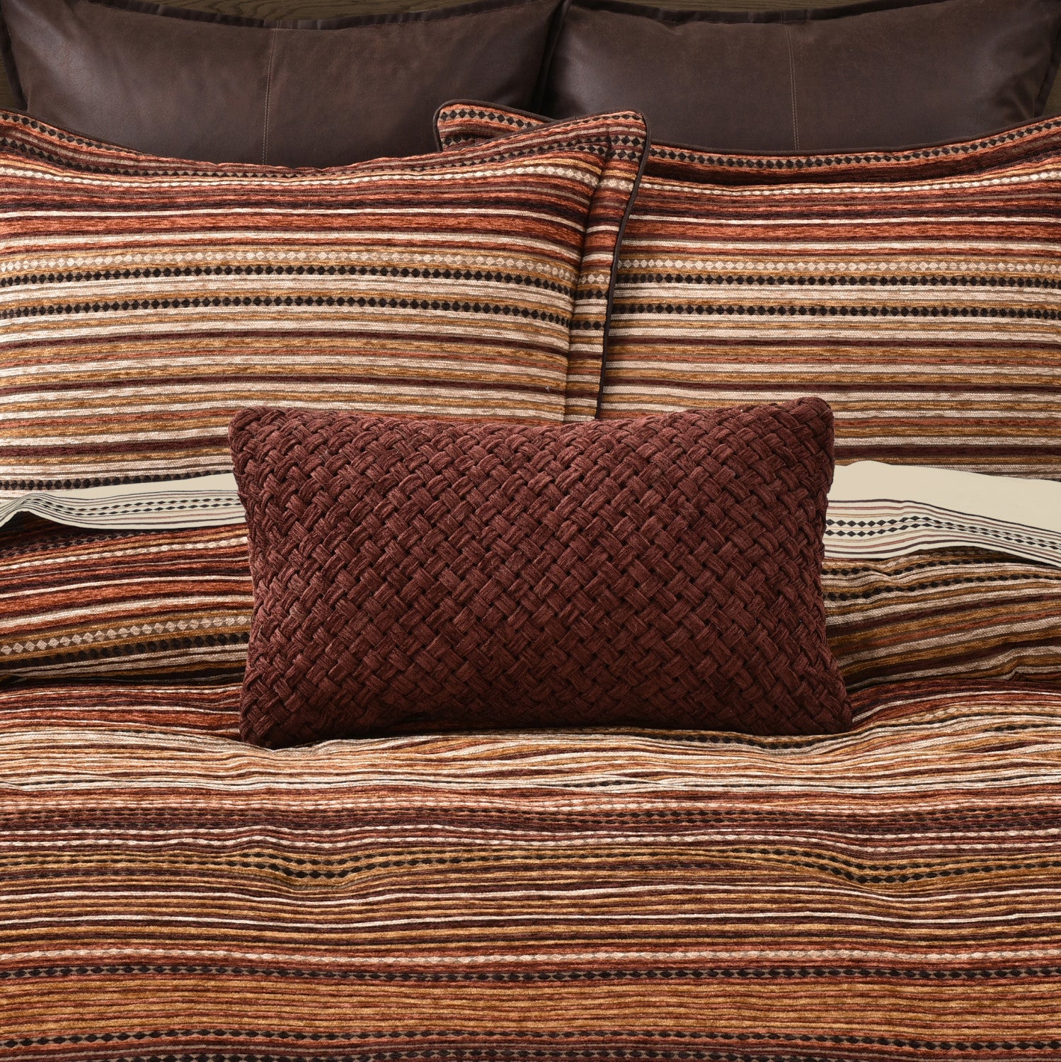 The Sundance Boudoir Pillow features an intricate braided pleat technique on the face and a woven chenille reverse. in a rusty burnt sienna color. This handmade accent pillow is made to coordinate with the Sundance bed set for a complete look.