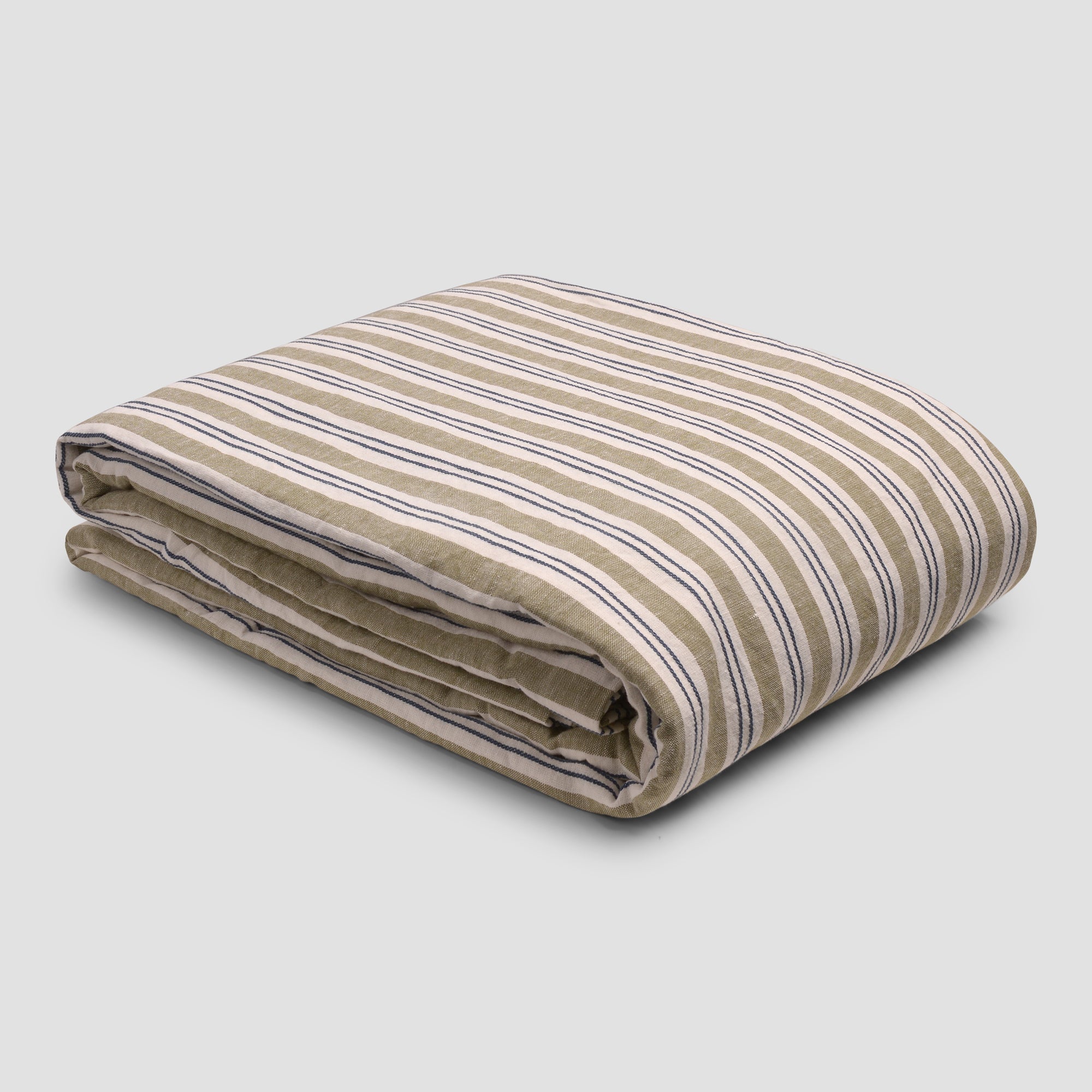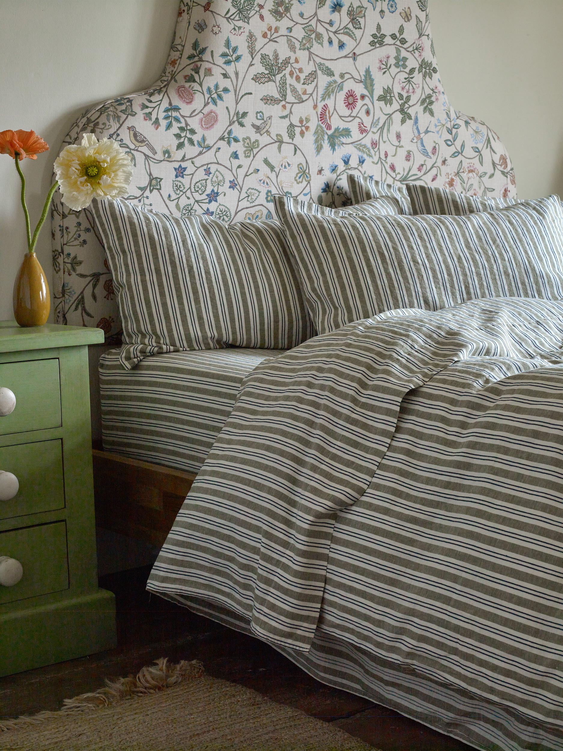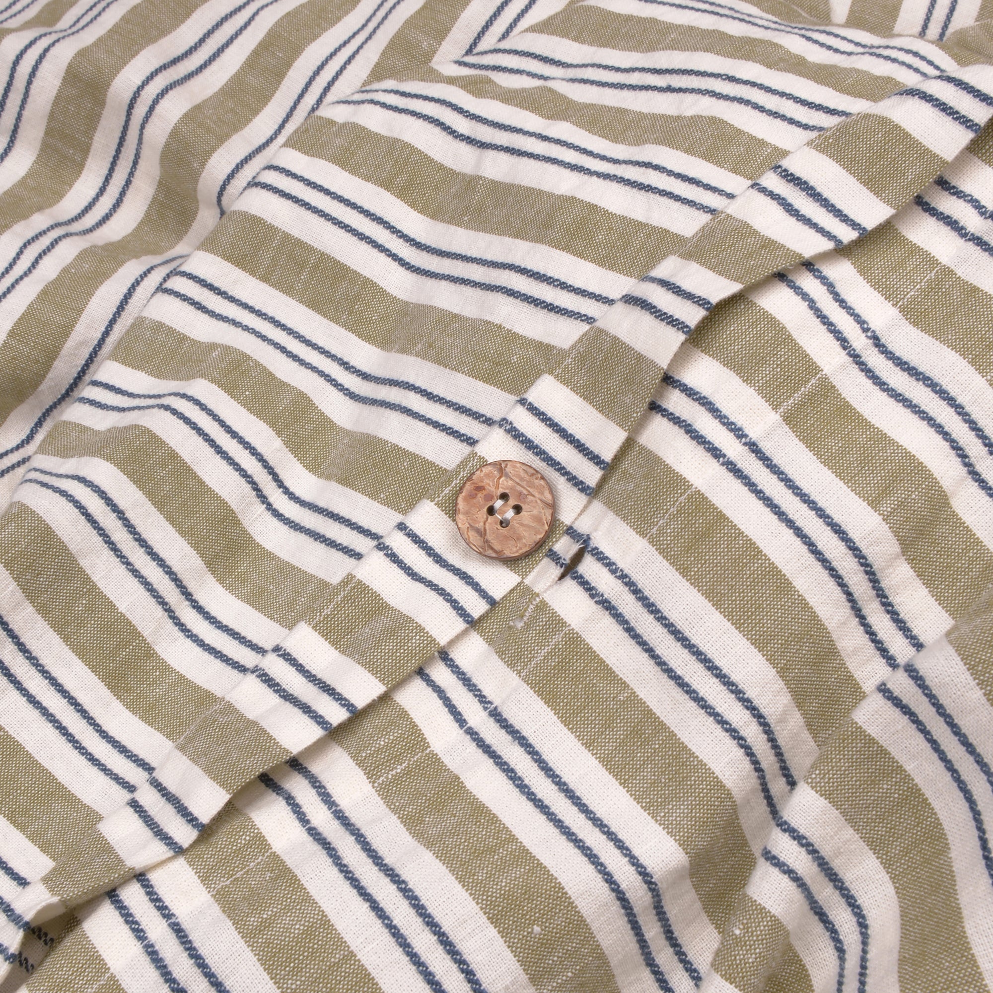 Our heritage-inspired Thyme Somerley stripe duvet cover features a classic warm green stripe interspersed with a patterned dobby weave for extra dimension. Made from a blend of European linen and cotton. this wonderfully breathable. comfortable and durable fabric offers the best of both worlds. This duvet cover features coconut shell button fastenings and handy inside corner ties to stop your duvet from slipping.