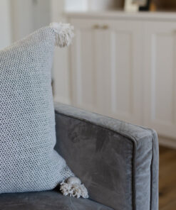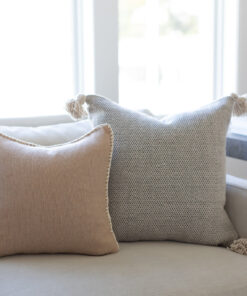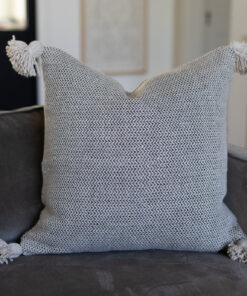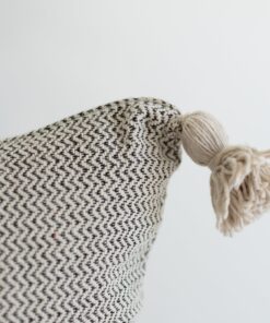 Elevate your home decor with the enchanting charm of our Tweed in Cream. Crafted by skilled artisans in Morocco. this exquisite pillow is available in two sizes. 18 and 22. and features a creamy base adorned with intricate black stitching and tassels (that can be removed if desired) on each corner.