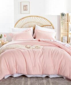 The blush pink comforter features tightly woven and double soft microfiber contributing to a silky soft feel, lightweight, and breathable.