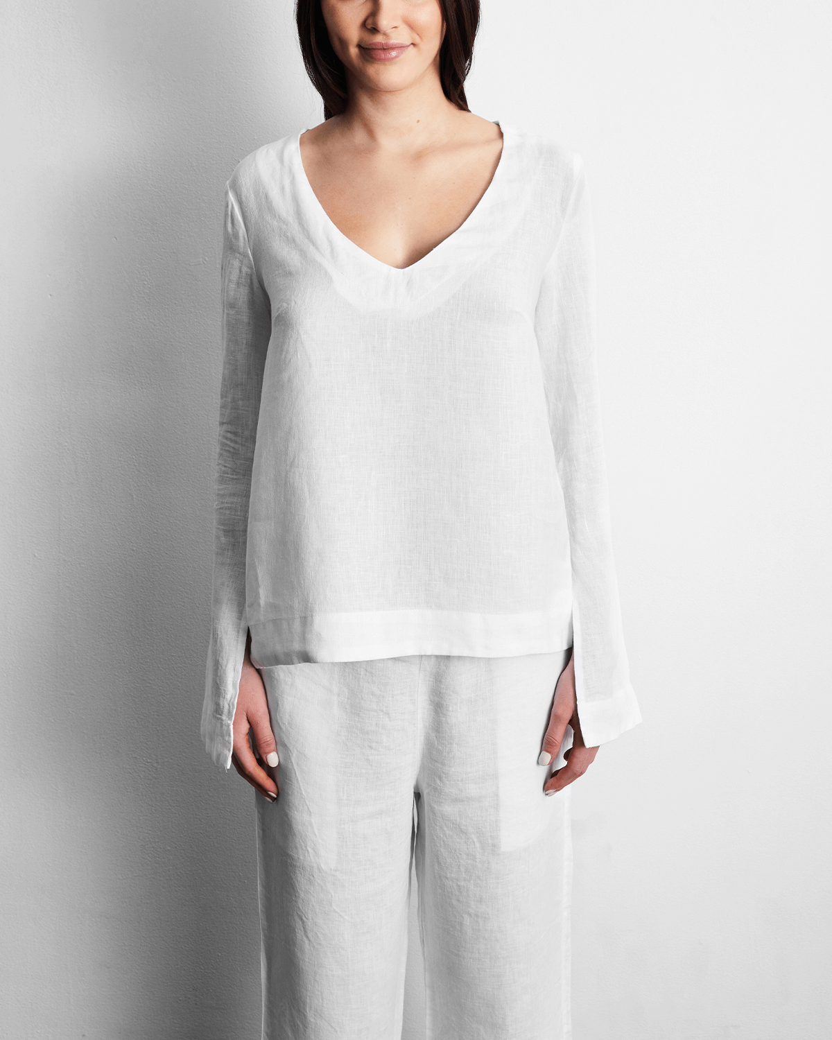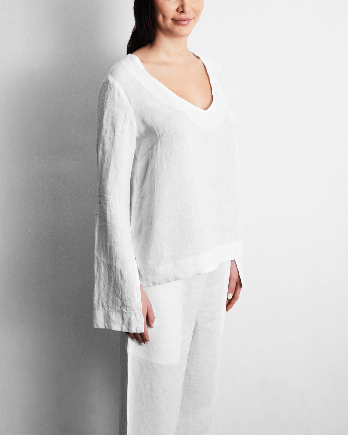 Easy. breezy and comfortably oversized. our 100% French Flax Linen Top is the pyjama shirt of your dreams. The billowing bell sleeves and deep v-neckline are a nod to the ’70s. while the loose silhouette and buttery soft fabrication is made for relaxed days spent in or out of the house. Pair with our 100% French Flax Linen Pants for the ultimate co-ordinated two-piece look. or style it on its own with the bottoms of your choice—trust us when we say this sartorial multi-tasker will be one of the hardest working pieces in your wardrobe.
